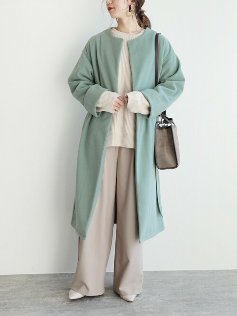 □pick up□ オンオフ問わず使えるアウター◎ ノーカラーコートで上品さも演出しつつ、首元がすっきりとして見えます♪ タートルネックやマフラーでのオシャレも邪魔することはありません!! ”ノーカラーロングコート リボン付き” カラー:グレイッシュベージュ / アイボリー / グリーン系その他 サイズ:S / M \7,480-
