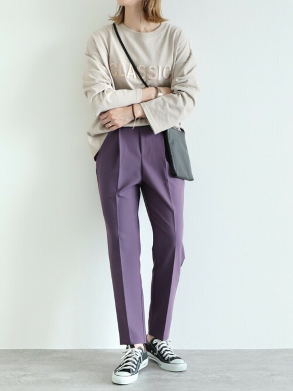 □hit item□ パープルカラーで一気に秋らしいコーディネートができる! センタープレスが入っているので、簡単に美脚シルエットが手に入ります◎ 着回し力のあるアイテムなので、小物や靴を変えるだけでもグッと変化をつけれる♪ \9/2までお得な期間限定プライスで販売しております!/ ”美シルエット センタープレステーパードパンツ” カラー:ダークパープル / モカ / グレイッシュベージュ / ブラウン / グリーン系その他2 / ブラック / ネイビー / イエロー ¥2,831-special sale