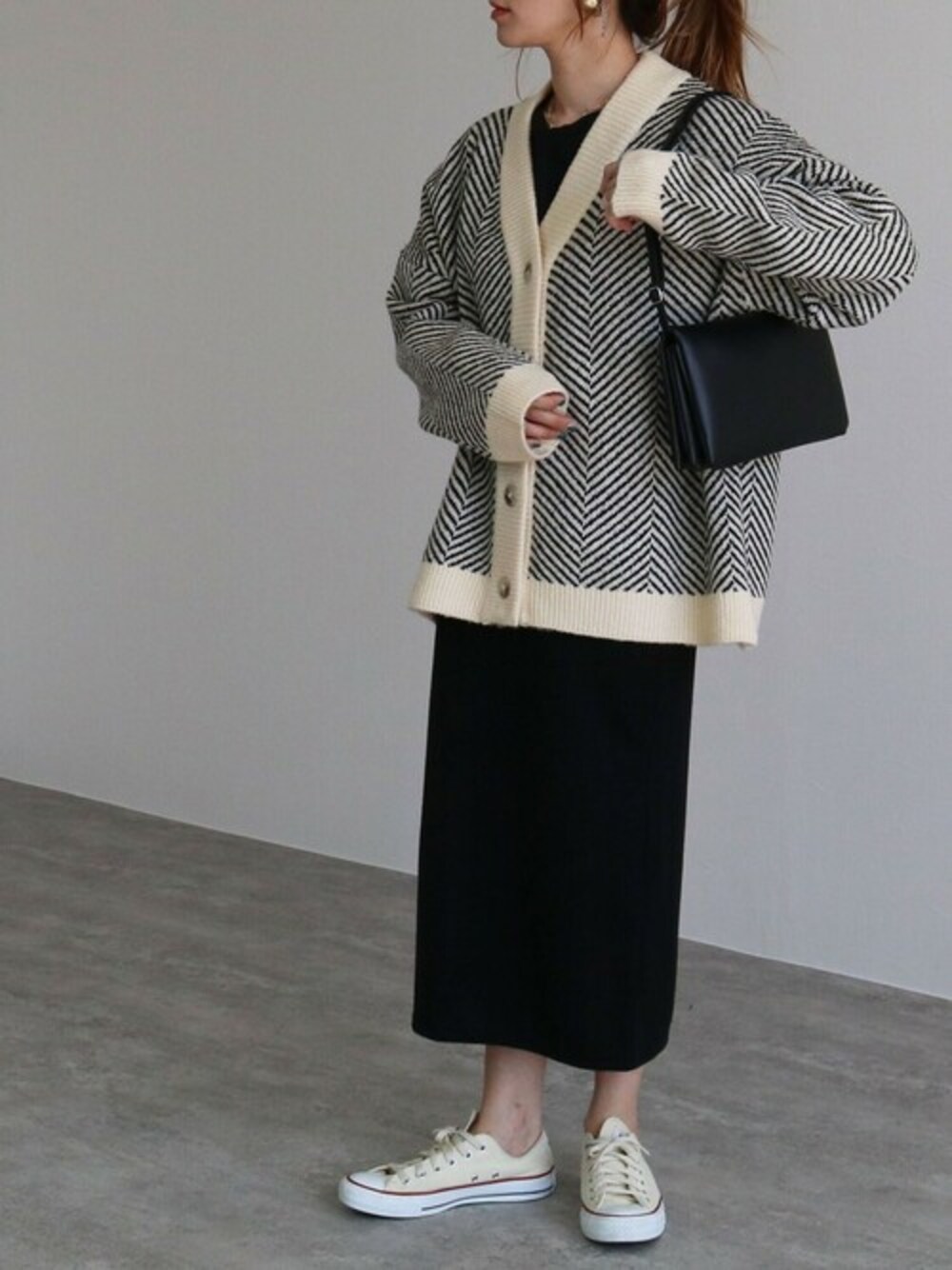 ■2021AW PICK UP■ 今年の秋の旬アイテム! ヘリボーン柄のニットカーディガンが登場!! レトロなヘリボーン柄が印象的なビッグシルエットのカーディガン。 Vネックラインですっきりとした印象です♪ 生地は厚めですので、軽アウターのようにも使えますよ◎ \ZOZOWEEK開催中!/ ”ヘリンボーンニットカーディガン” カラー:ブラック / ライトグレー ¥5,276-special sale