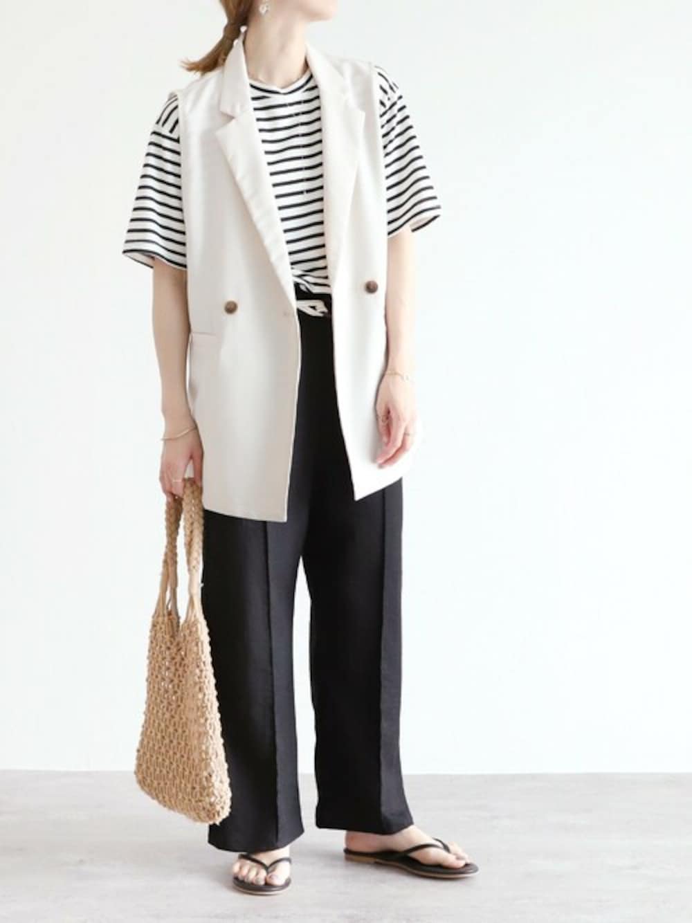 ■2022SS NEW ITEM■ テーラーの襟付きで、どんなアイテムにもきちんと感をプラスできます。 肌離れの良い質感で、春夏シーズンだけでなくオールシーズン着回しOK! 普段着から、ちょっとしたお食事、参観など様々なシーンで活躍します。 ”Wテーラーベスト” カラー:アイボリー / イエロー / ブラック ¥4,180-