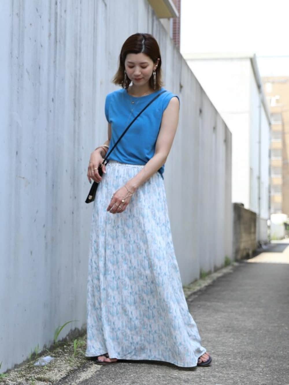 ■2022SS HIT ITEM■ 涼し気なカラーが目をひくペイント柄のロングスカート。 サラサラしたシルクの様な光沢感があり高見えするのが嬉しい♡ ストレッチが効いていて、ロング丈でもアクティブに動けて快適です。 同じトーンのカラー合わせで、大人カジュアルなおでかけコーデの完成です。 ”リネンミックスノースリーブTシャツ” 【6color】 ¥2,200-special sale "ペイント柄ロングスカート" 【2color】 ¥3,630-special sale