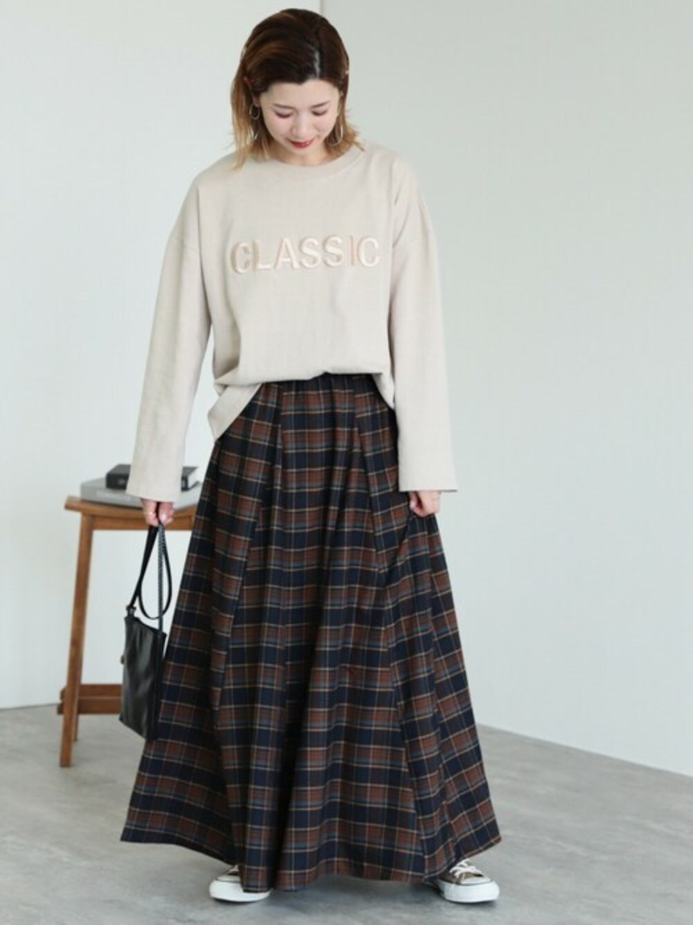 ■2022AW PICK ITEM■ 昨年の秋冬にもrecaで大人気♪チェックロングスカート! 贅沢にたっぷり使った生地がふんわり揺れてかわいい♡ カジュアルのテイストをプラスして ロゴTシャツ×スニーカー合わせにも◎新色も要cheak!! ”チェックロングスカート” 【3color】 ¥5,247-special sale ”立体ロゴ刺繍ロングスリーブTシャツ” 【4color】 ¥3,850-