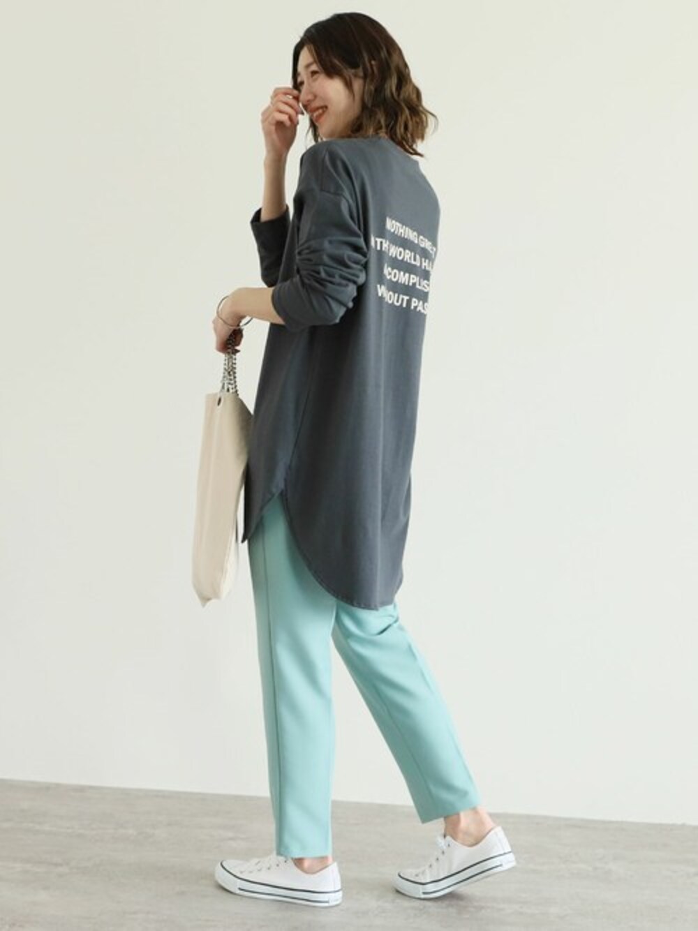■2023SS NEW COLOR■ 2023NEWカラーのグレー系その他(チャコールグレー)が登場♡ バックロゴで後ろ姿もかわいい♪長めのロング丈長袖Tシャツ! 程よいゆったり感でこなれ感が漂う♪ サイドスリットと裾のラウンドカットがスッキリ見せします◎ ”バッグロゴプリントロンT” 【3color】 ¥3,480- ”【低身長サイズアリ】美シルエット センタープレステーパードパンツ” 【16color】 ¥3,300-special sale