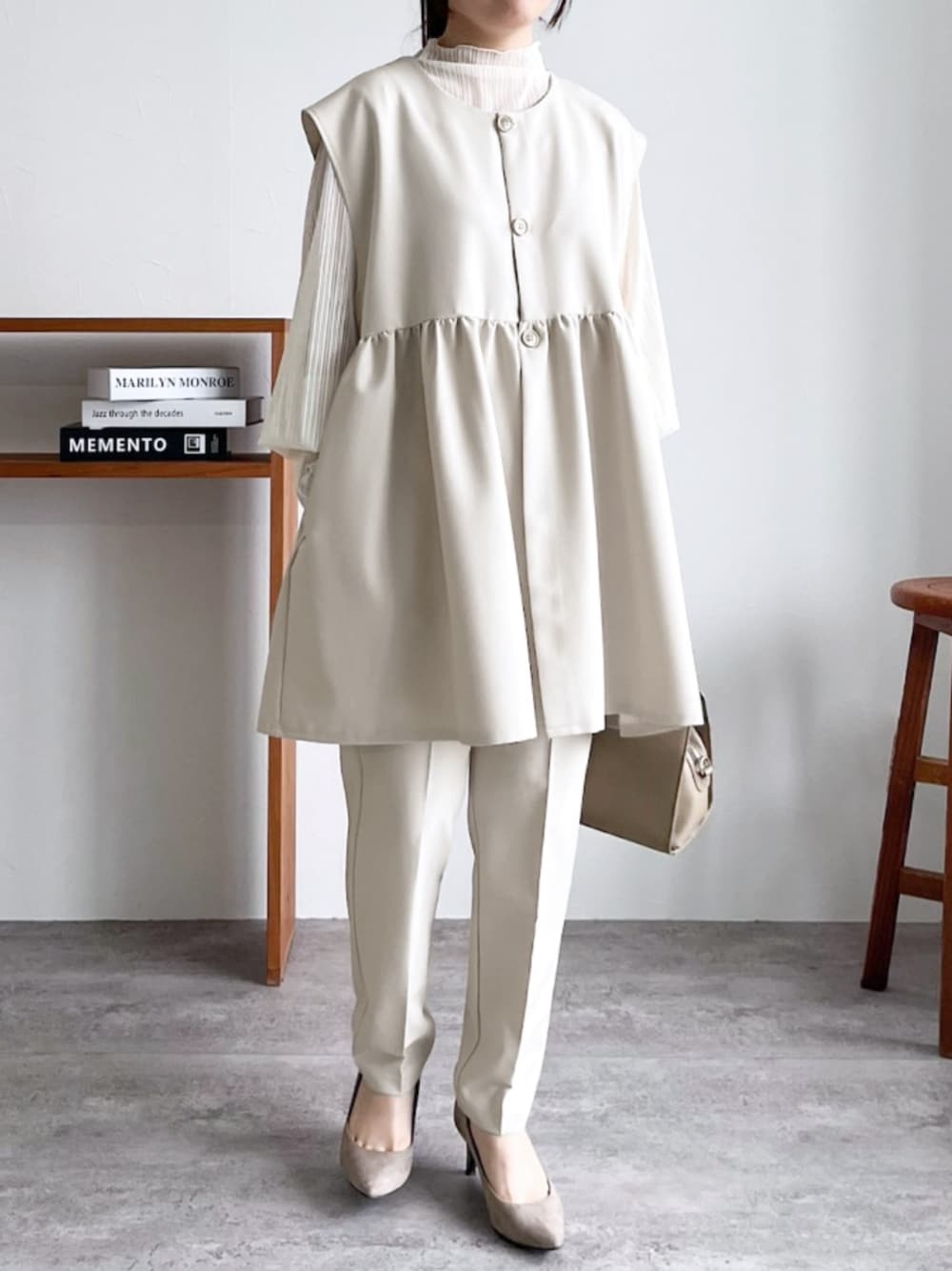 recastaff(reca)のスーツベスト「ペプラムギャザーベスト」を使ったコーディネート