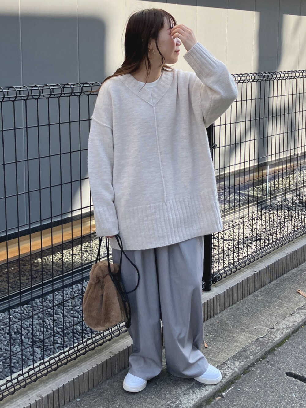 今日のコーデ ”Vネックオーバーサイズニット” "スリータックカーブパンツ" 今っぽいリラクシーなコーディネイトです♡ ぜひ、チェックしてみてくださいね♪