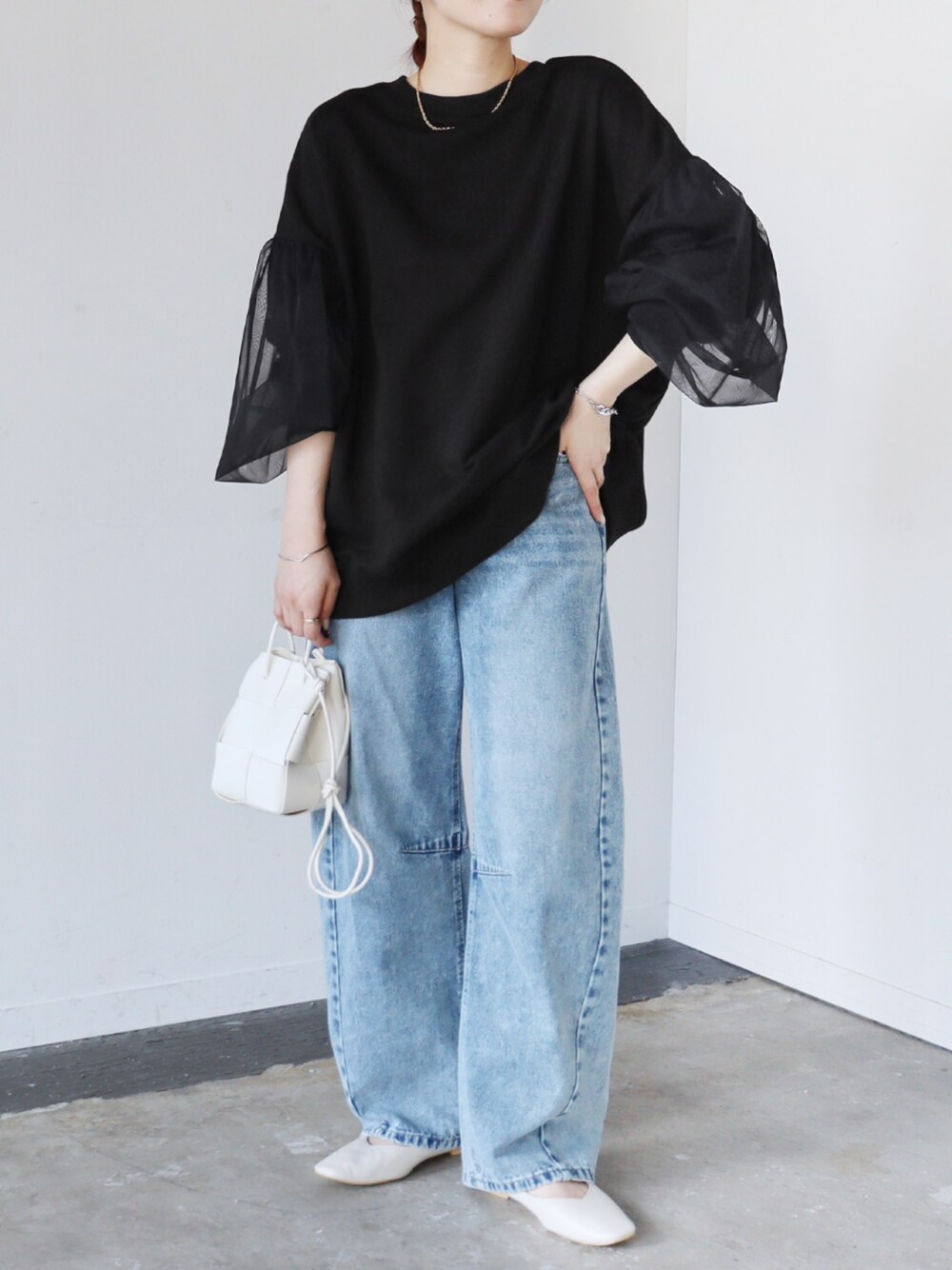 "チュール袖スウェットプルオーバー" "デニムバレルレッグパンツ" チュールアイテムで春ムード🌷
