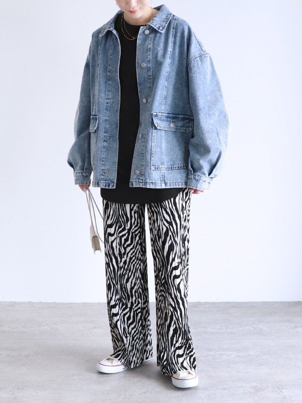 \今だけ【500円OFFクーポン】配布中/ ”迷わず着れる!大人のセミワイドプリーツパンツ“ ”デニムワークジャケット” ”裾ラウンドロンTシャツ” このままマネするだけで、春の旬コーデが完成します🛒