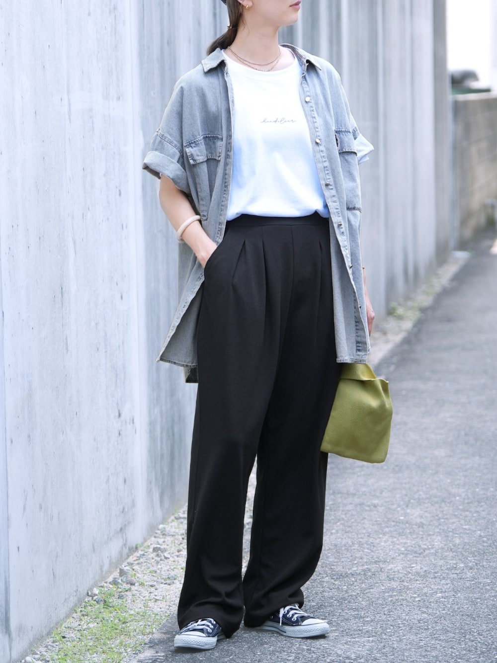 🍉reca🍉 ▶半袖デニムシャツ ▶筆記体プリントロゴTシャツ ▶カットジョーゼットタックパンツ instagram @reca.zozotown