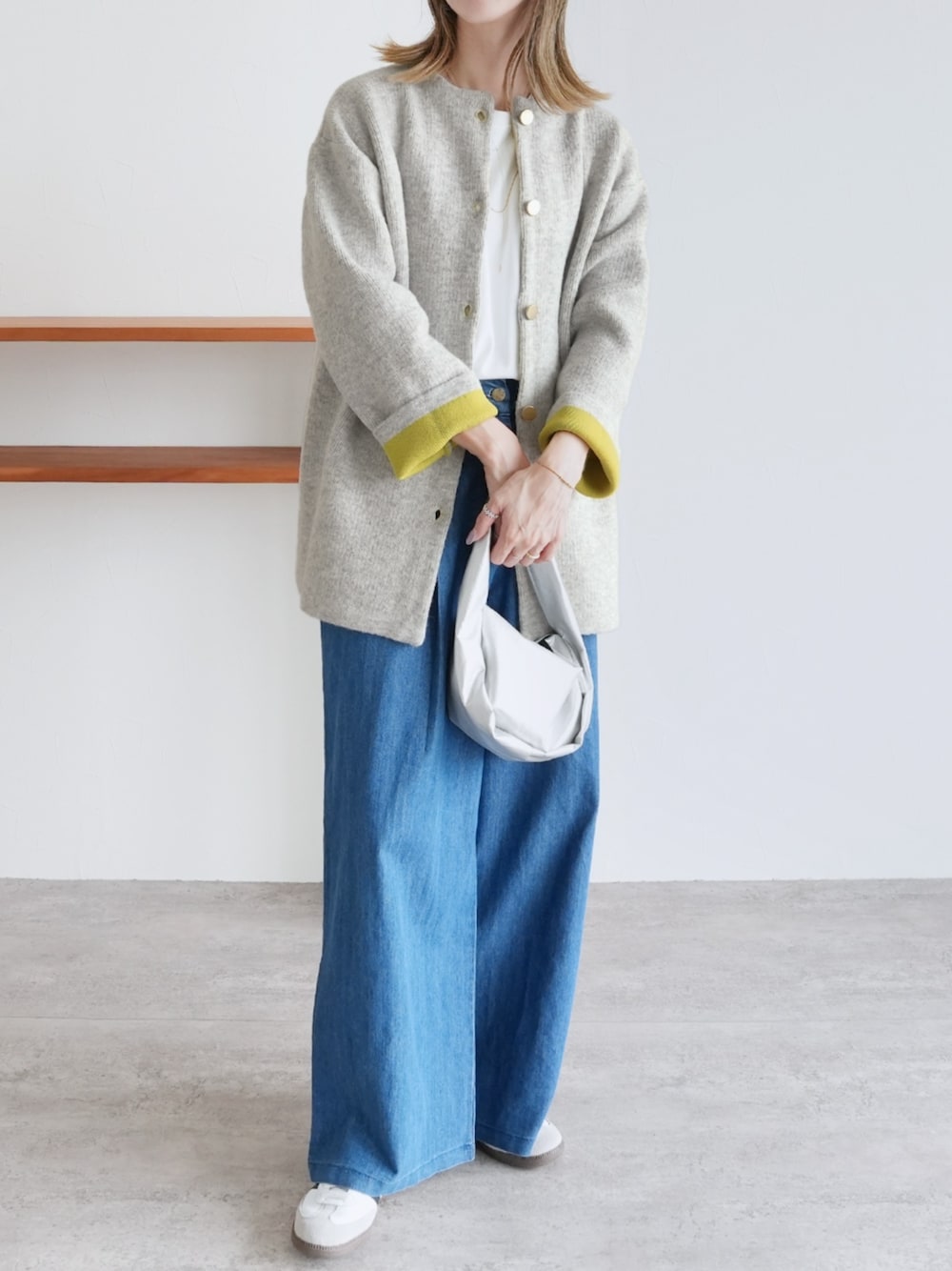 recastaff(reca)のノーカラーコート「Wフェイスニットコート」を使ったコーディネート