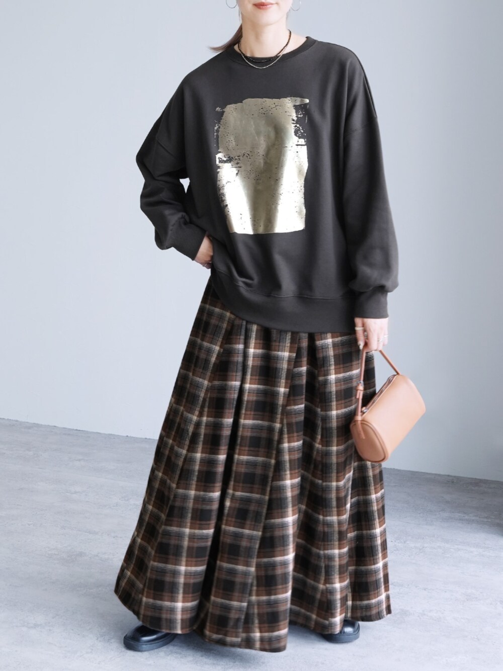 \2025AW NEW ARRIVAL/ reca ▶裏毛箔プリントBIGプルオーバー ▶チェックフレアスカート instagram @reca.zozotown