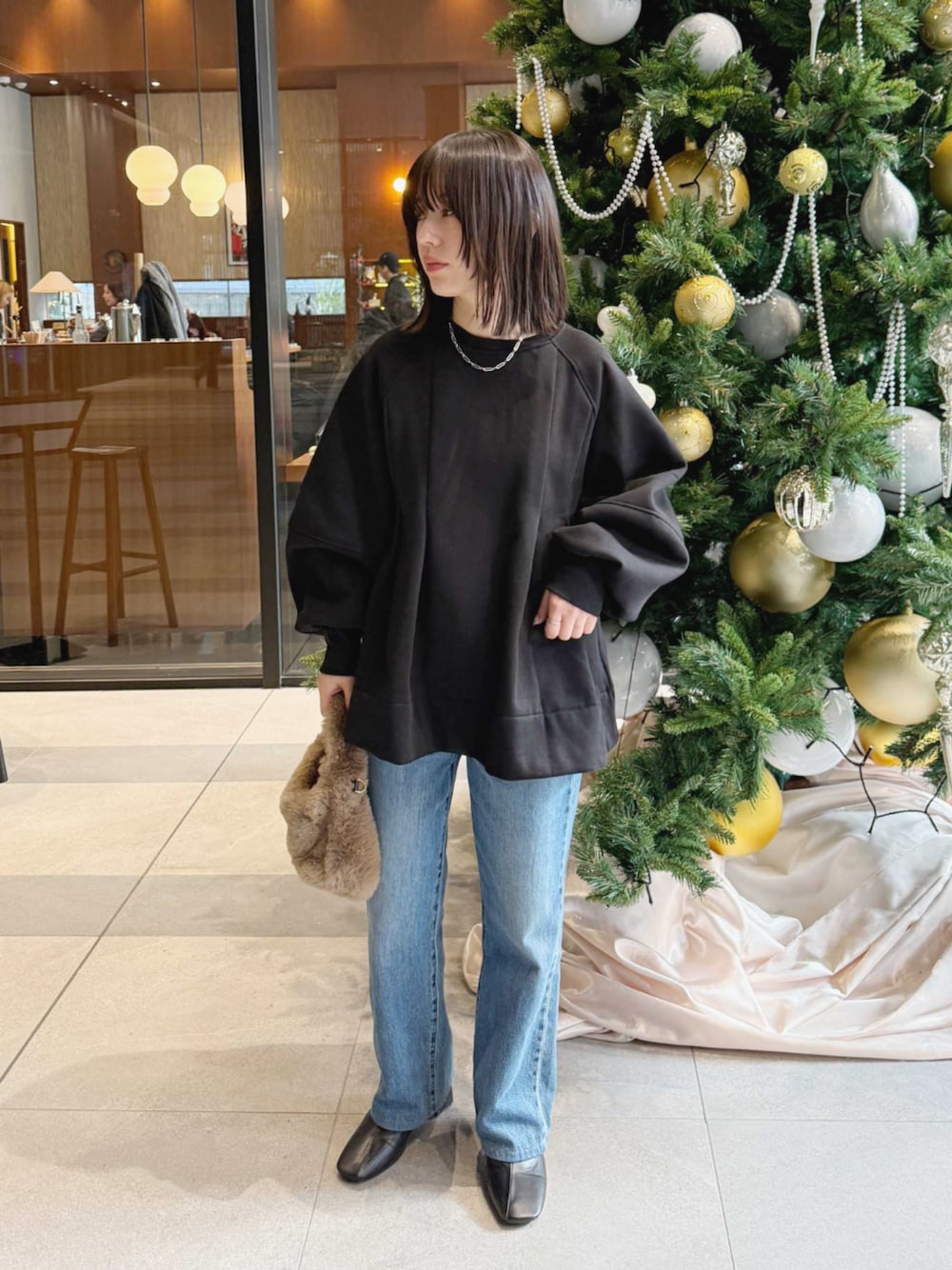 ブラック系のスウェットを着用したレディースの冬コーディネートの1枚目の写真