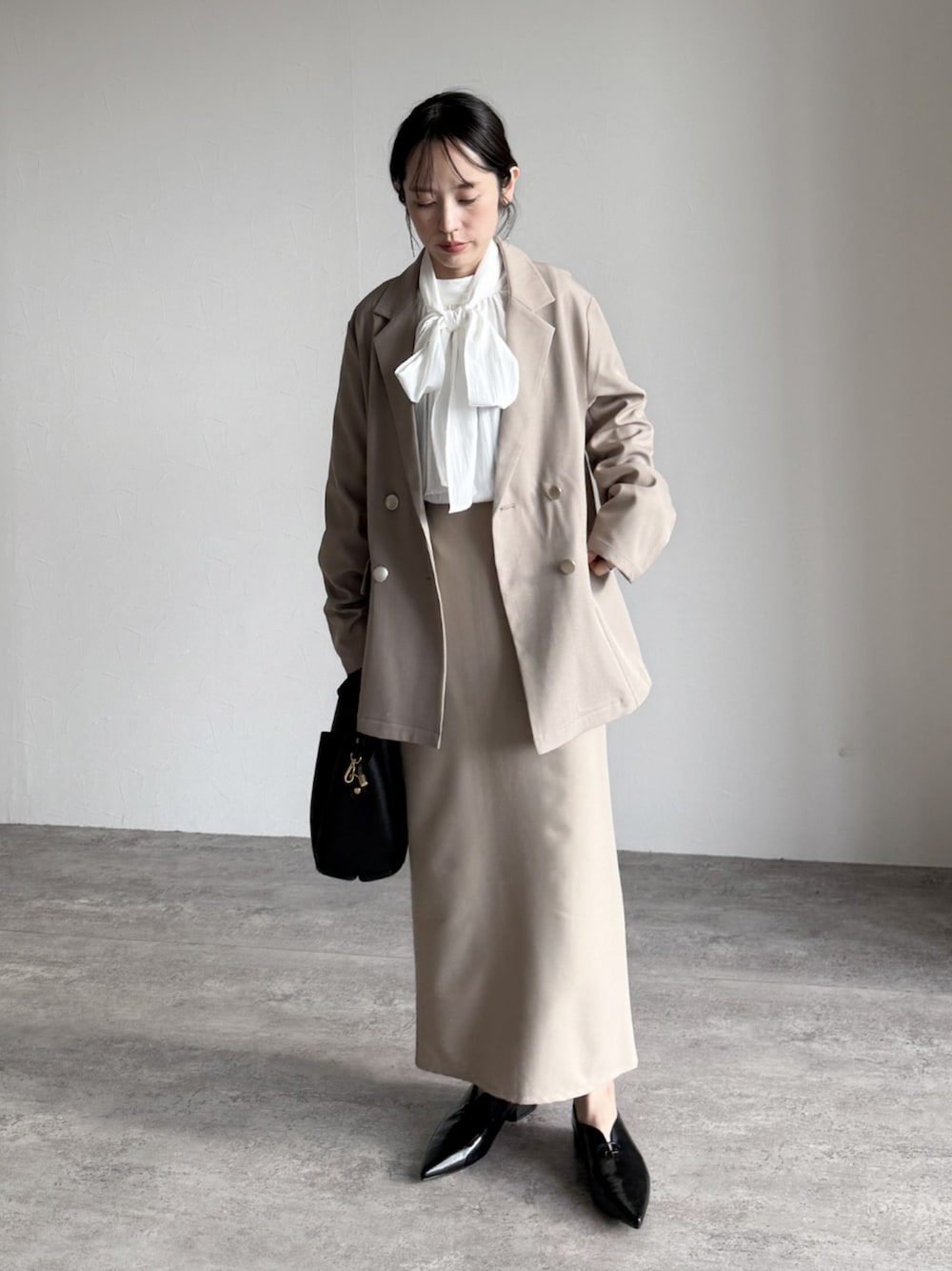 \セレモニーアイテム販売中!/ reca 🌟NEW🌟 ▶チェック/ダブルテーラードジャケット ※ベージュ着用 FREE ▶ボウタイ付きギャザーブラウス ▶Hラインロングスカート instagram @reca.zozotown