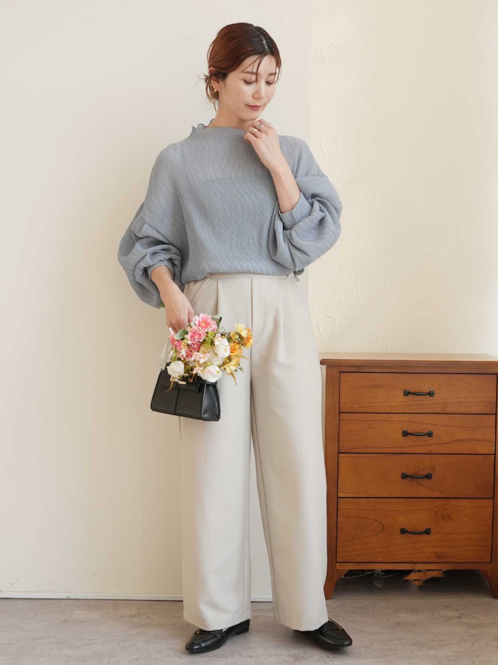 \セレモニーアイテム販売中!/ reca ▶ハイネックランダムプリーツボリュームスリーブブラウス ▶セミワイドストレートパンツ instagram @reca.zozotown