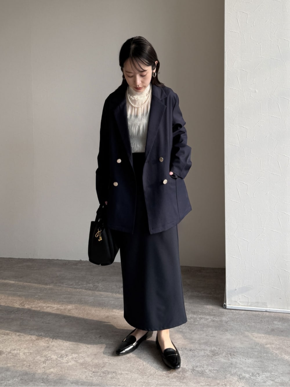 reca ▶チェック/ダブルテーラードジャケット ▶Hラインロングスカート ▶ハイネックシアーギャザーブラウス instagram📷 @reca.zozotown