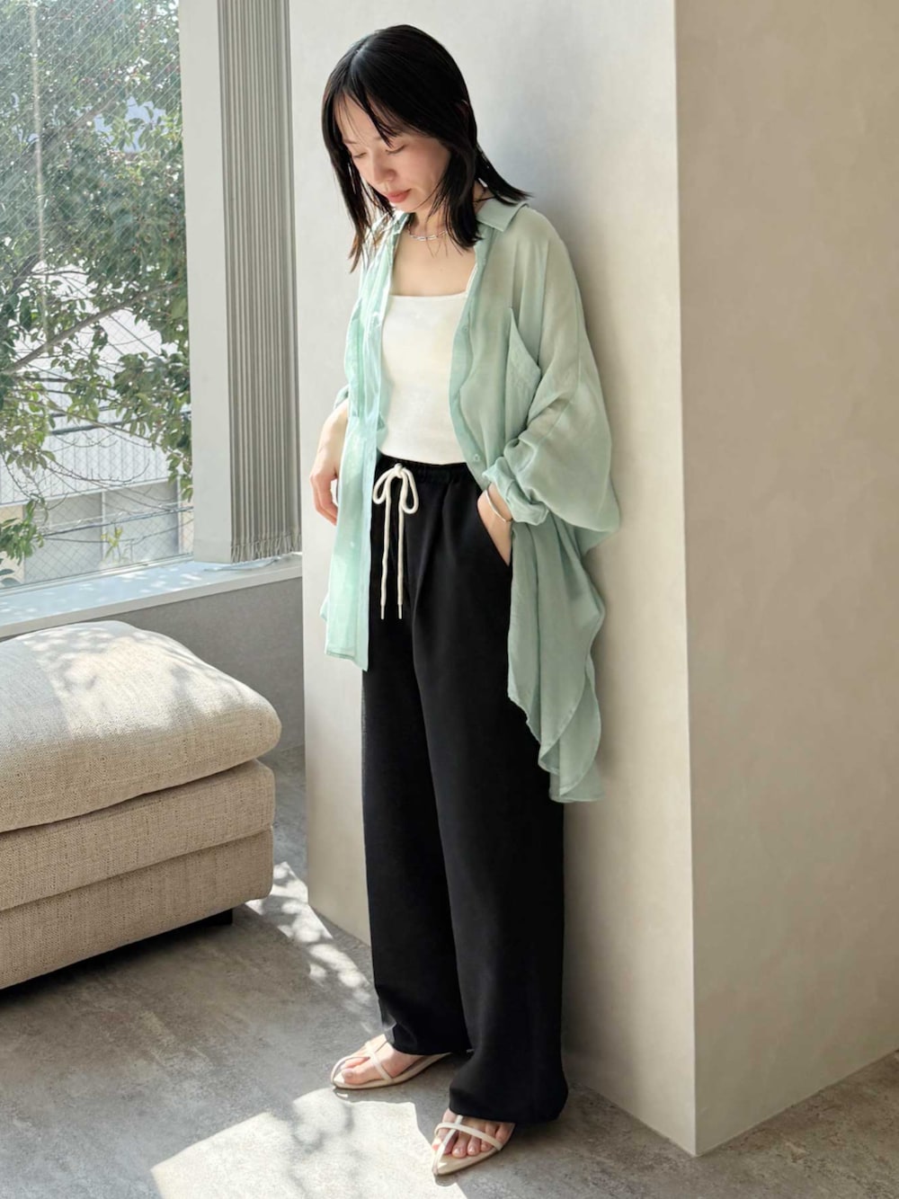 reca ▶シアードルマンシャツ ▶バンブーカップ付きキャミ ▶無地/ストライプエンボス加工イージーパンツ instagram📷 @reca.zozotown