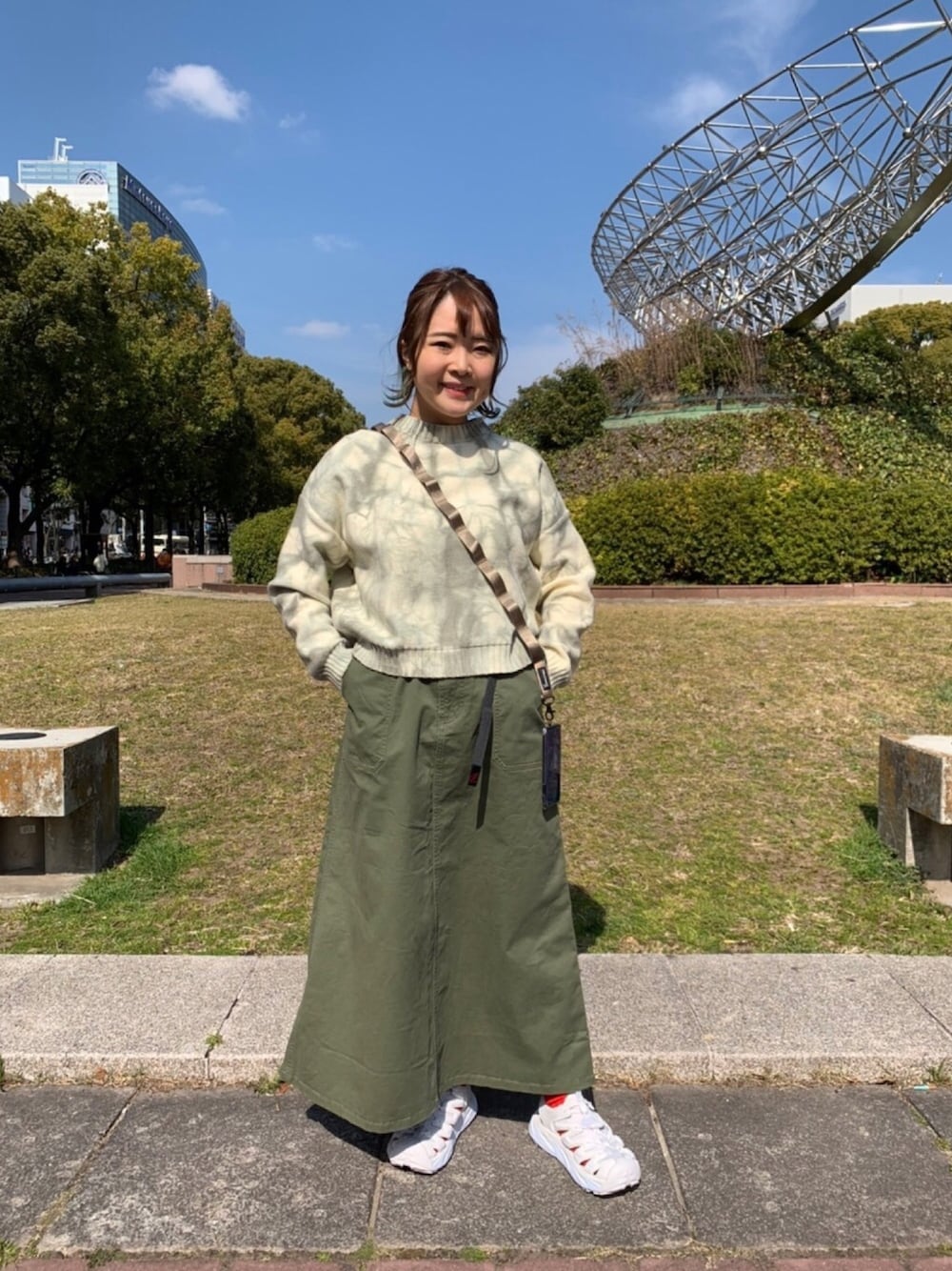 MANASTASHのコットンニットにGRAMICCIのベイカースカートを合わせてホワイトのサンダルで春らしく軽やかなコーディネートにしました🌸