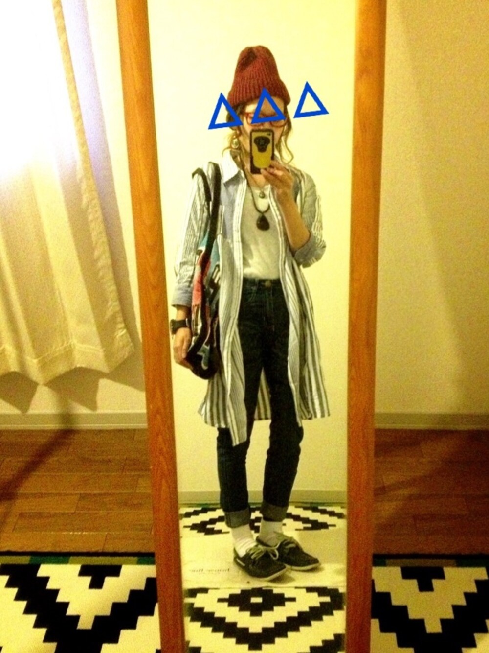 とっても久々のUP。 なんだかずっとバタバタしてました。 今日はダサファッション。 水色✖白のストライプシャツが 春な感じです。 今日はポカポカだった! 全て ノーブランド。