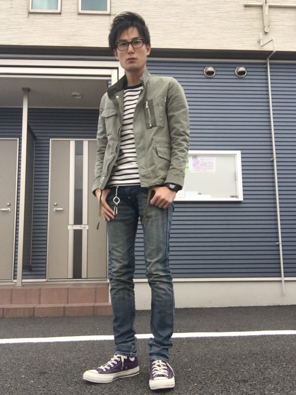 factotumの春夏のミリタリージャケットを使ったコーディネートです。 ミリタリーアイテムは男臭くなりがちですがシルエットがタイトで色合いも上品なのでうまく中和してくれます。