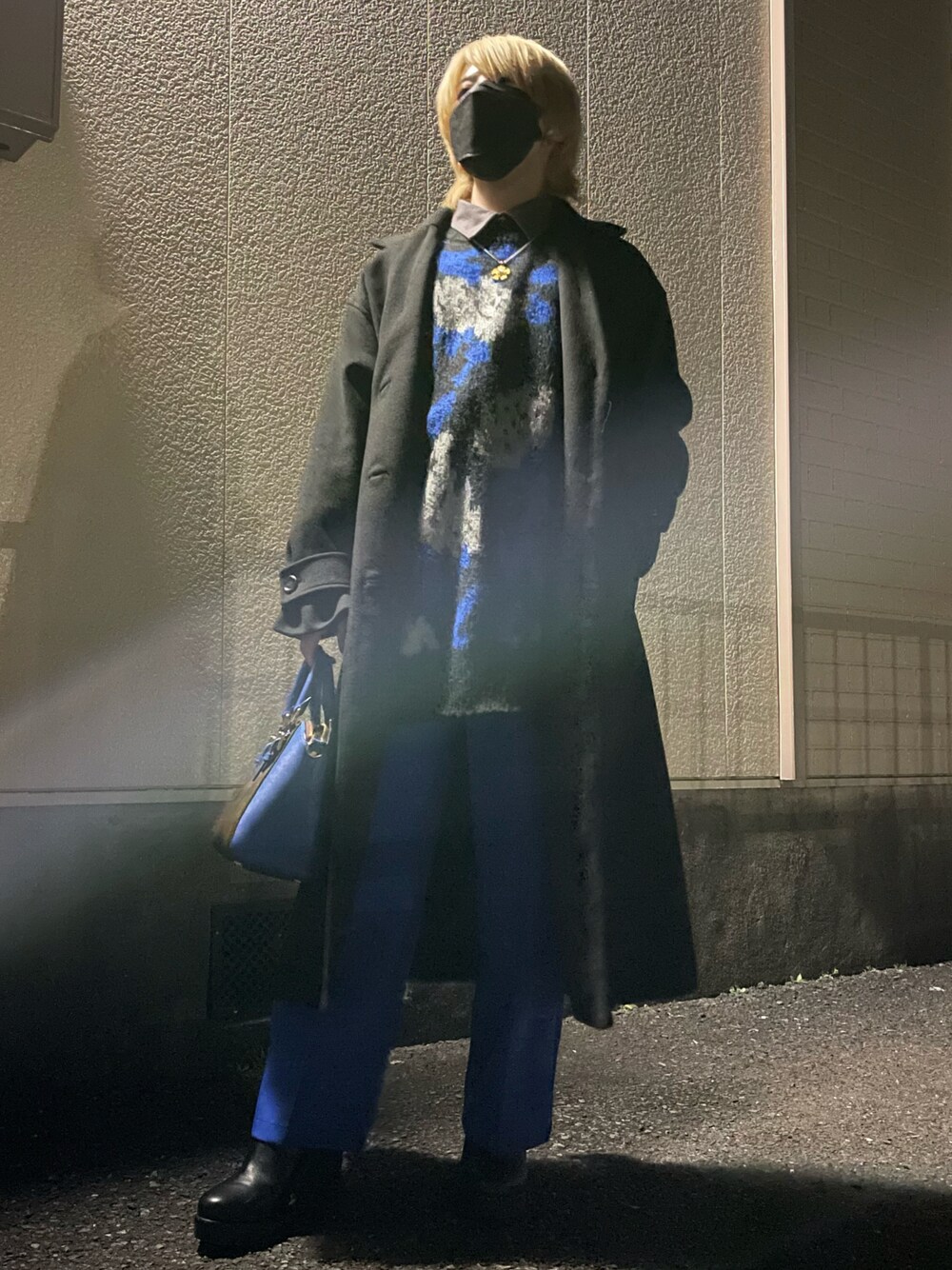 全体黒で落ち着いた雰囲気 ブルーで差し色ニットお気に入り
