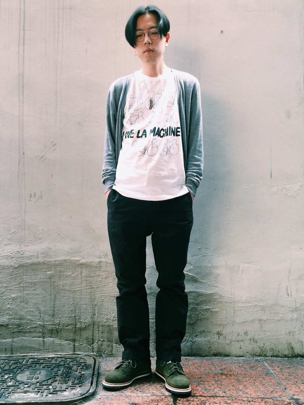 Tee_woodwood Cardigan_americanapparel Pants_nonnative Shoes_bepositive x stussy Glasses_americanoptical