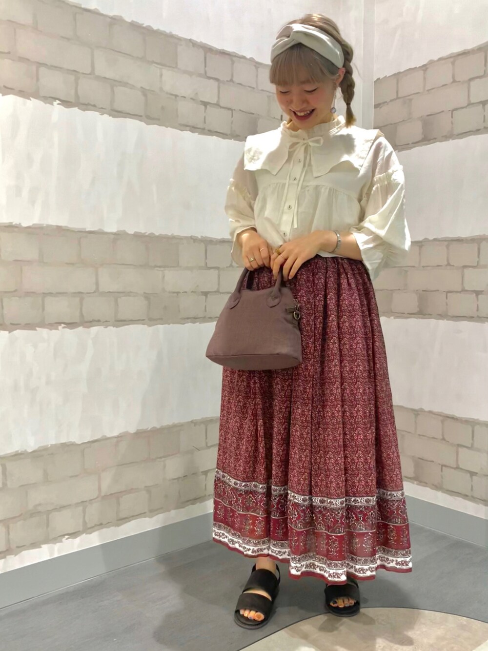 ご覧頂きありがとうございます*.+゚ 本日は北欧ガール風コーディネートのご紹介です🇸🇪 前回つけ襟のみ使用したブラウスのオフのお色を🦢 5分袖ですが、サラサラとした素材感なので今の時期から着ていただけます! 目を引く柄の赤スカートは裏地がしっかりついているため、足元のみ透けるようになっています。 陽の光が当たると影が透けてとってもかわいいです🌞 池袋サンシャインシティ店には毎日秋物アイテムが続々と届いております☺︎ 感染症対策を万全にしてご来店お待ちしております!