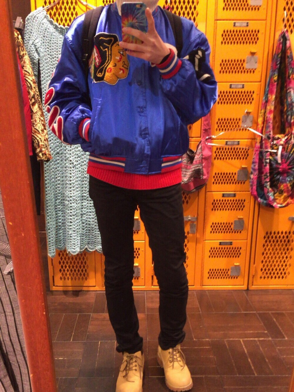 古着屋さんで購入したワッペンがたくさんあるスタジャンがポイントです^_^