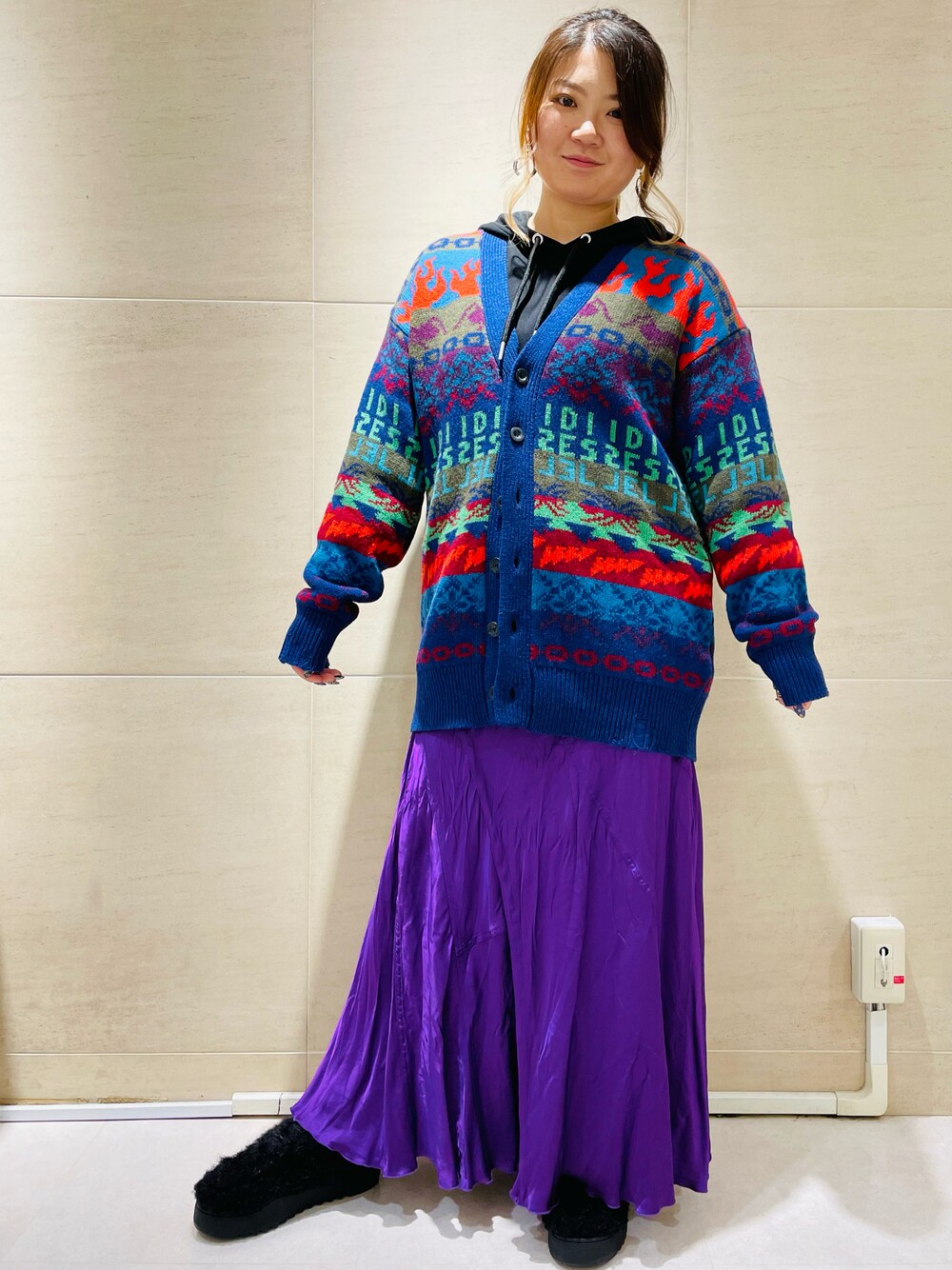 冬のノルディックなカーデに少しカジュアルなフーディーのパーカー合わせで🎶 流れの出るスカートで楽に抜け感を💕