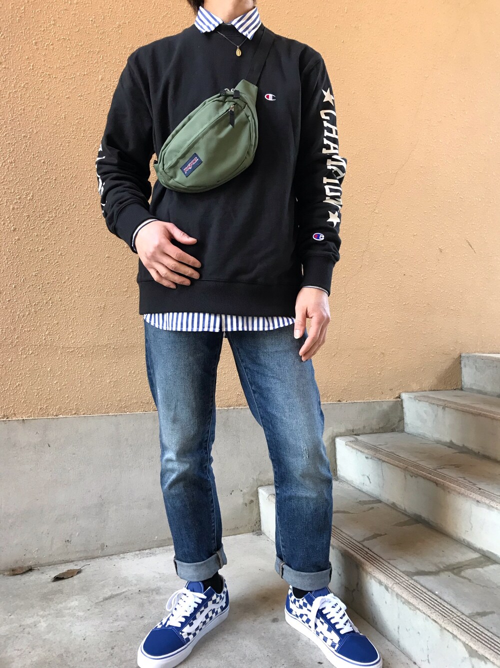 REDのスウェット「【Champion】スリーブプリントスウェットプルオーバー」を使ったコーディネート