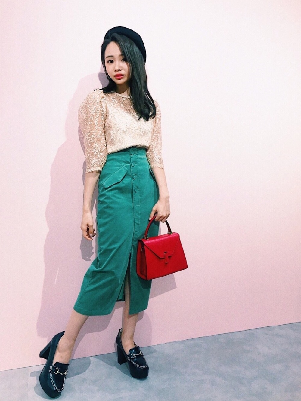 レーストップスにミントグリーンのタイトスカートを合わせて、春らしく❤︎