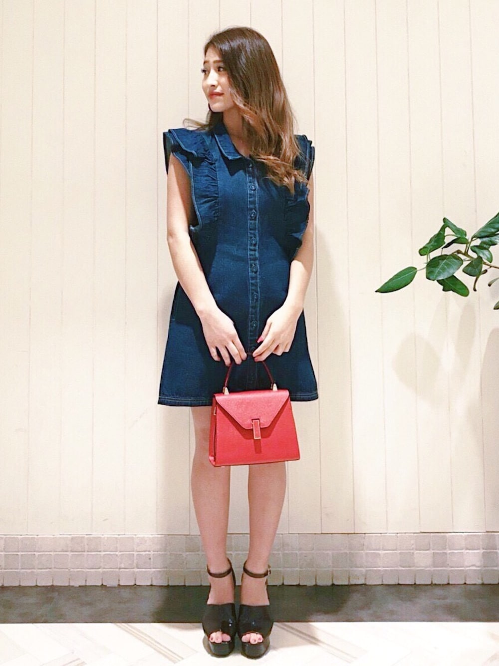 デニム×赤バッグでお洒落に♩ 大きめのフリルが体を細身に見せてくれます◎