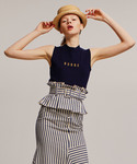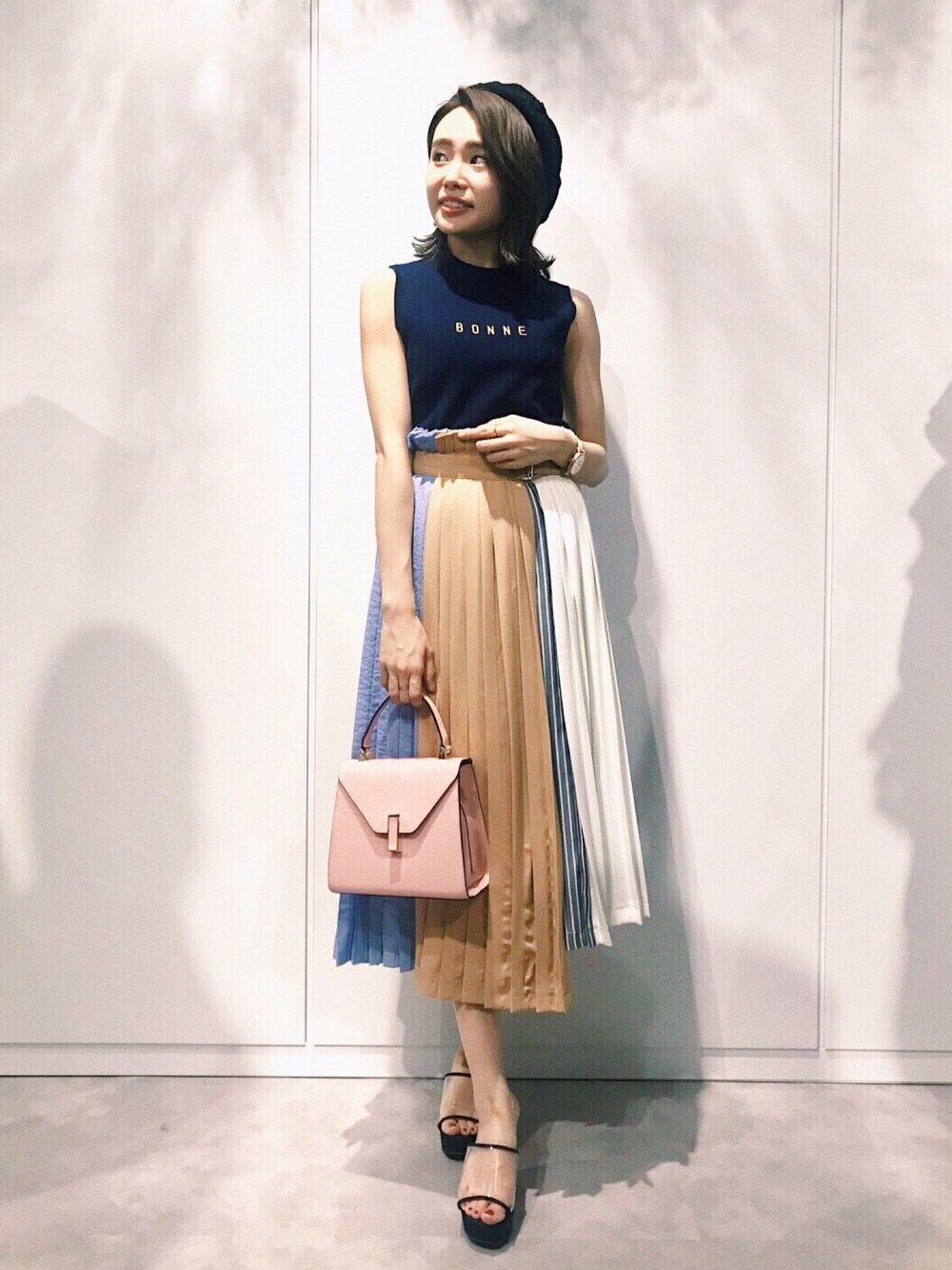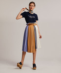 プリーツの巻きスカート×ロゴニット。 シンプルですがヒトクセあるコーデで今季らしい印象に◎