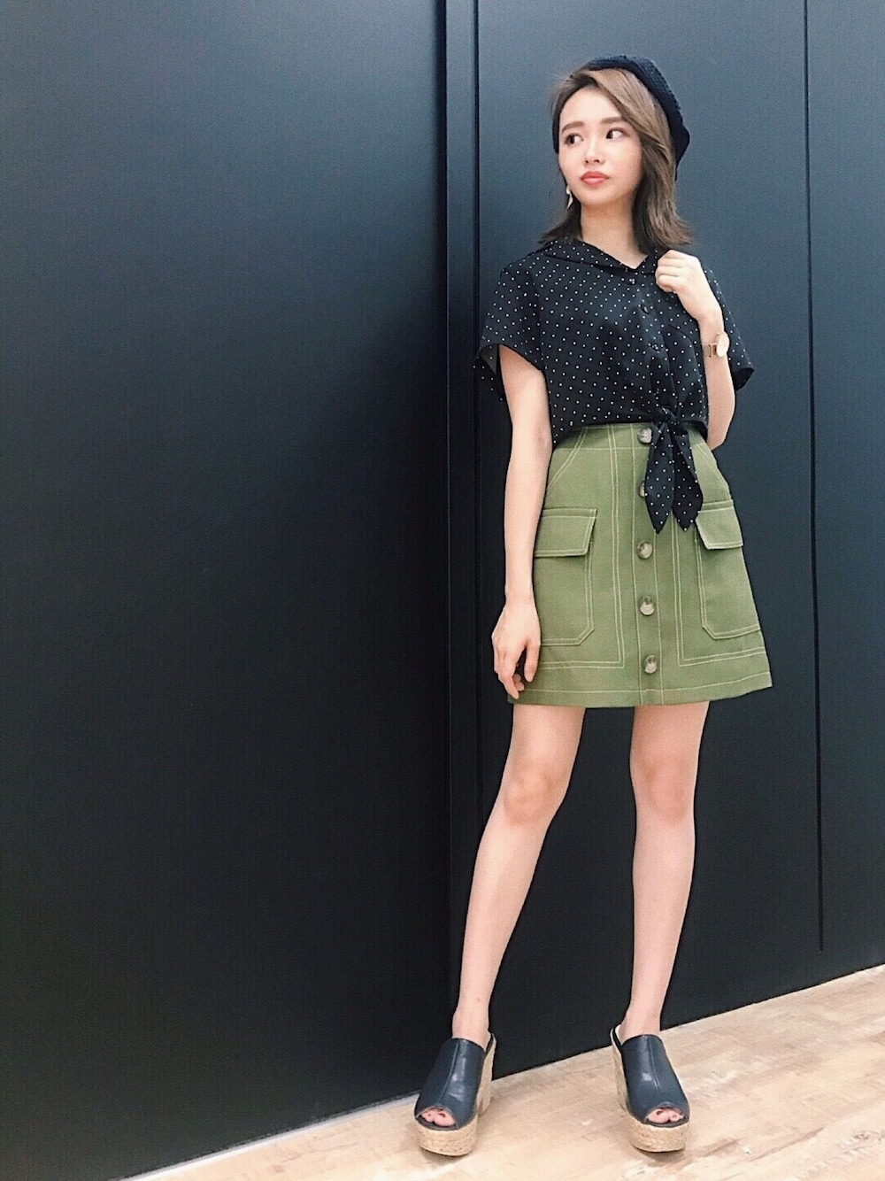 ドット×ロゴのトレンドデザインの前しばりシャツは、台形ミニスカートとあわせてカジュアルに。