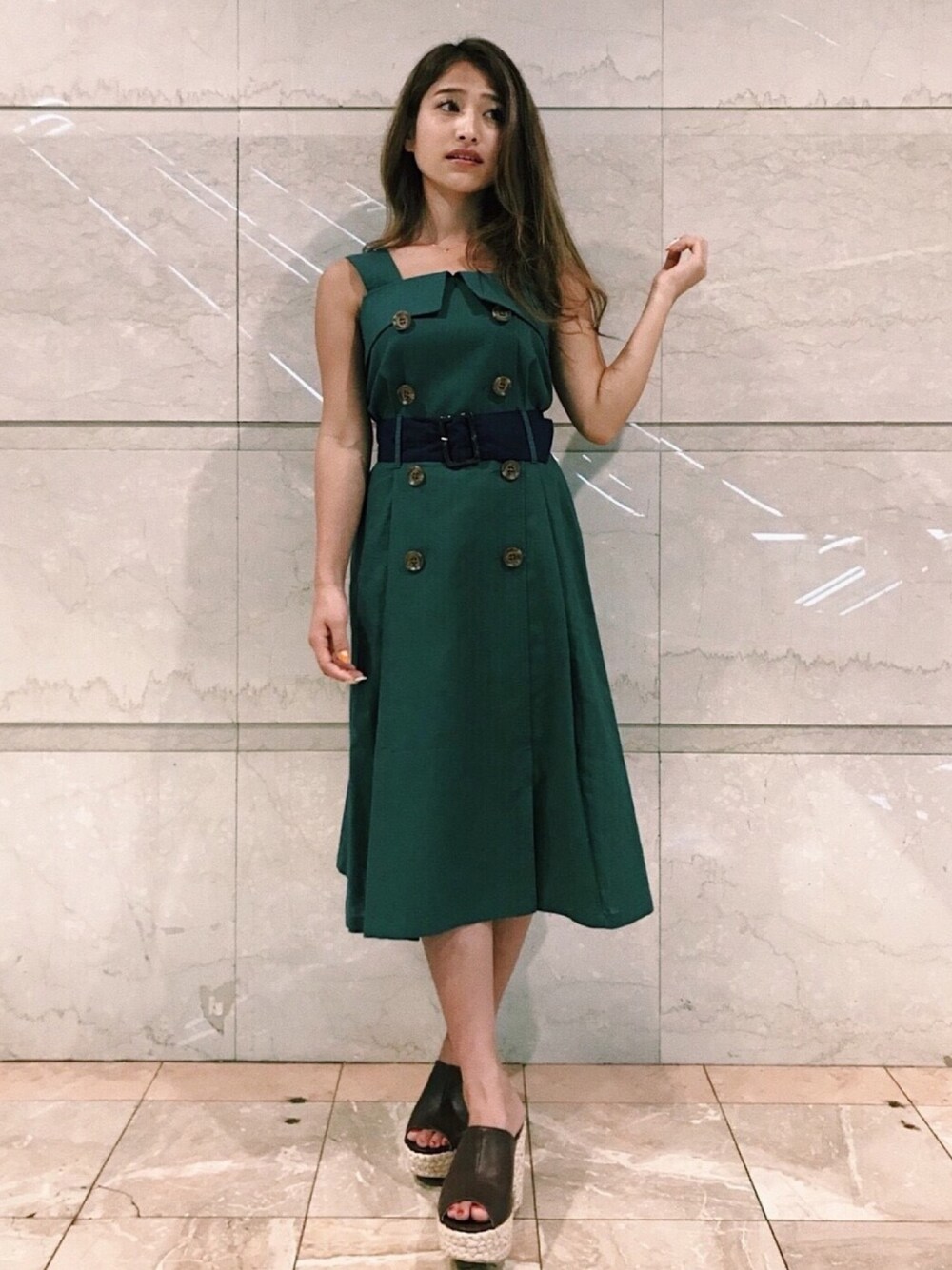 グリーンのトレンチワンピ。そのまま着てもTシャツやトップスをレイヤードしても◎