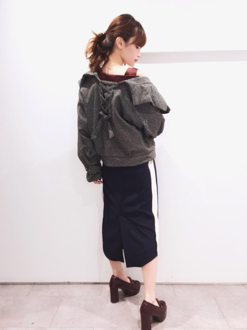 レースアップがかわいい 抜け襟アウター。 ストリートなラインスカートと合わせてよいバランスに◎