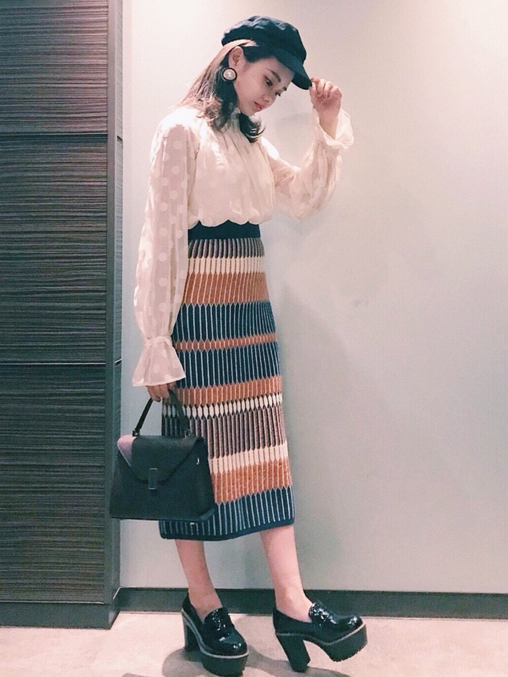 ドットブラウスにニットタイトスカートをあわせて綺麗めシルエットに。