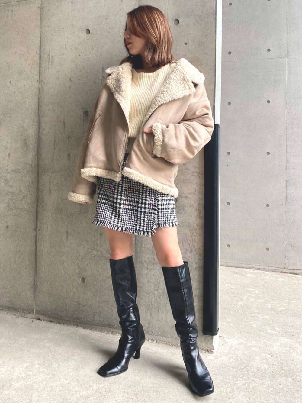 オーバーサイズのムートンライダースに、上品なツイードミニスカートを合わせて、あざと可愛いガーリーコーデ🌹 staff 160cm