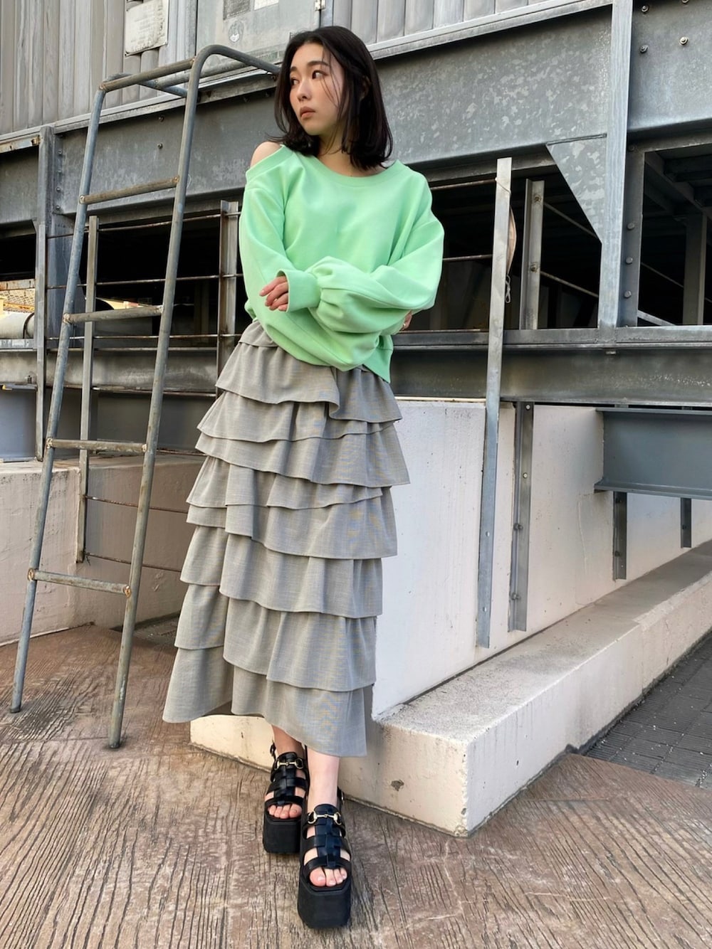 コンパクトにまとまるティアードスカートはガーリー過ぎず、トレーナーやTシャツで綺麗めにカジュアルコーデに◎ ビビットカラーのトップスで今年っぽく☺︎ staff163cm