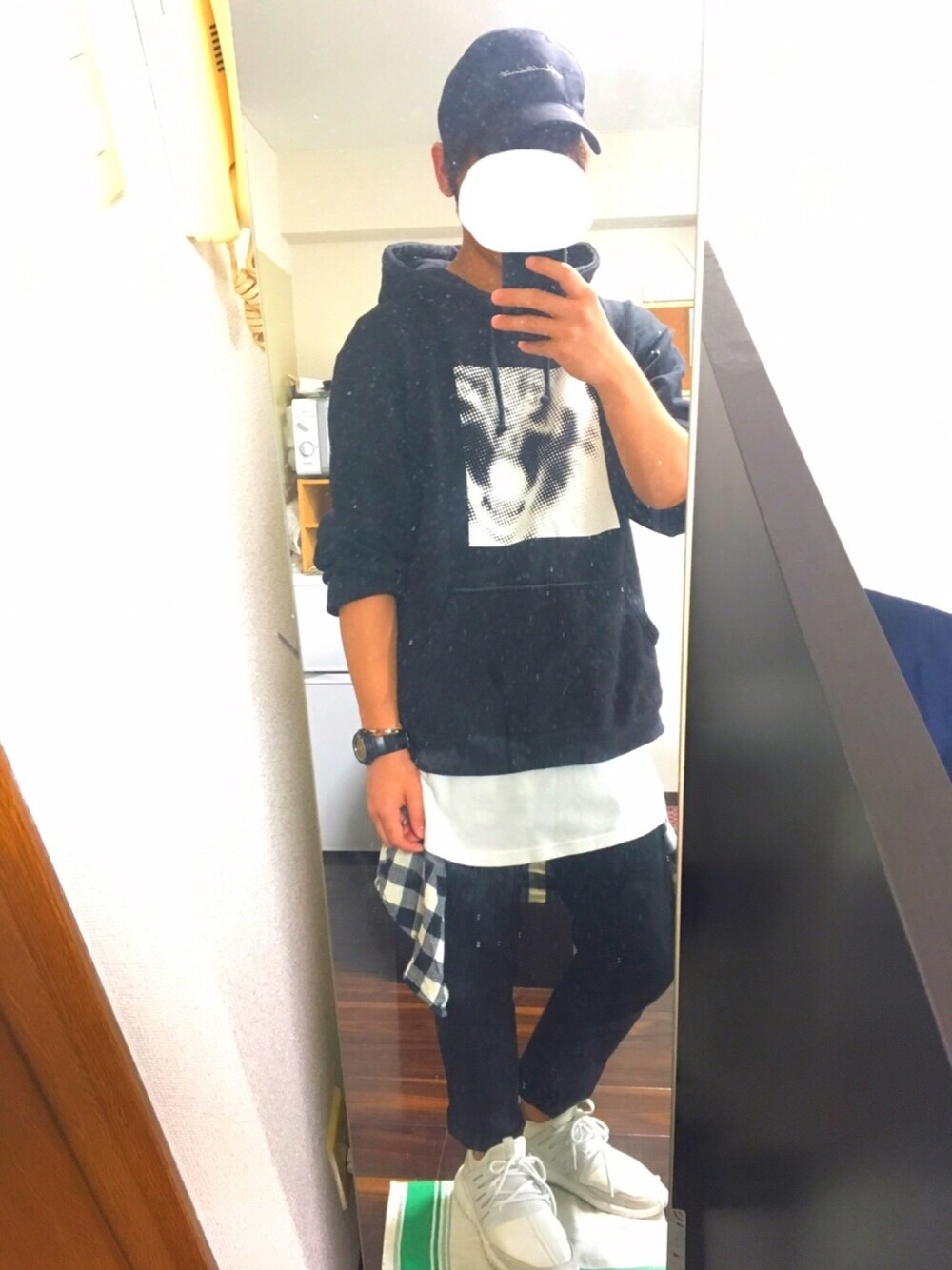 ご覧頂きありがとうございます。 ストリートコーデです。 パーカーにレイヤードをして、さらにチェックシャツを腰巻きして仕上げました。 モノトーン好きです。 今日はこんな感じです。
