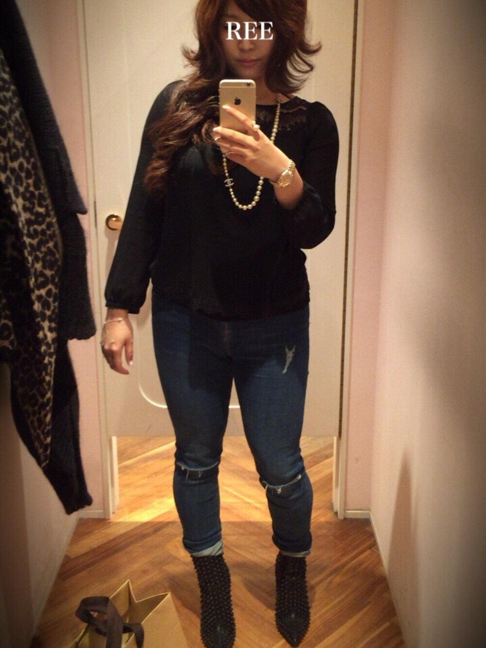 コートのレオパード×ブーツのスタッズでコートスタイルは辛めになりました☺︎ 中はブラックの胸元レーストップスにchanelのパールアクセサリーを合わせました。