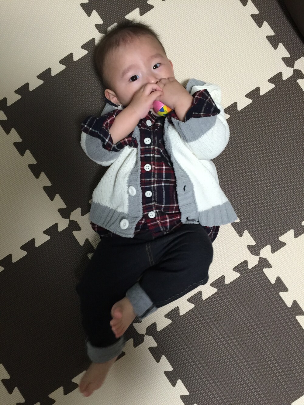 今日の息子くん♡ カーディガン60〜70だから最近ぴったりになってきた(﹡´◡`﹡ ) 息子くん.よく小顔ってびっくりされるけど、コンビニで買い物してたらレジの店員さんが、「うわ!すっごい顔ちっちゃーい!!」 他の店員さんに「ねえ!ちょっと見てみて!すごい顔ちっちゃいよー!」って😓 「やっぱり親が小顔だと子供も小顔なのね!」 ↑ちゃっかり私まで褒められて嬉しい♡笑 私そんな驚くほど小顔じゃないんだけどね(T_T) 4ヶ月違いの従兄弟と顔の大きさ変わらない息子くん♩ いったいこの小顔誰に似たのー(⊙ロ⊙)