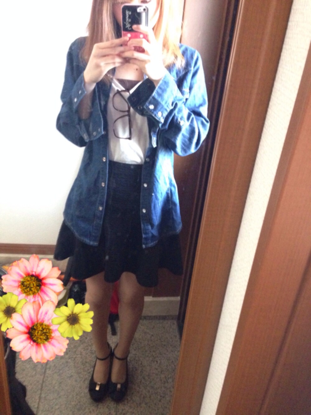 初デニムシャツ(>_<) 黒スキニー履くか迷ったけど、最近パンツばっかやから スカートにした(・∀・) グラサンじゃなくてメガネー WEGOで買ったやつ! 今日めっちゃ暑い(´・ω・`)