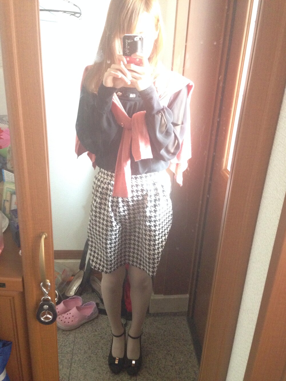今日は大人っぽくかつ 春らしくピンクカーデ肩がけ! 夜は寒いからめっちゃ困るなぁ〜