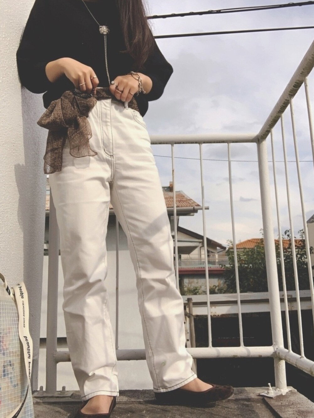 何年か前に買ったGUのホワイトデニム🤍 ステッチが黒で可愛い🖤 腰に巻いてる古着のスカーフも最近買ったループタイもお気に入り🤒 ご覧いただきありがとうございます🤝