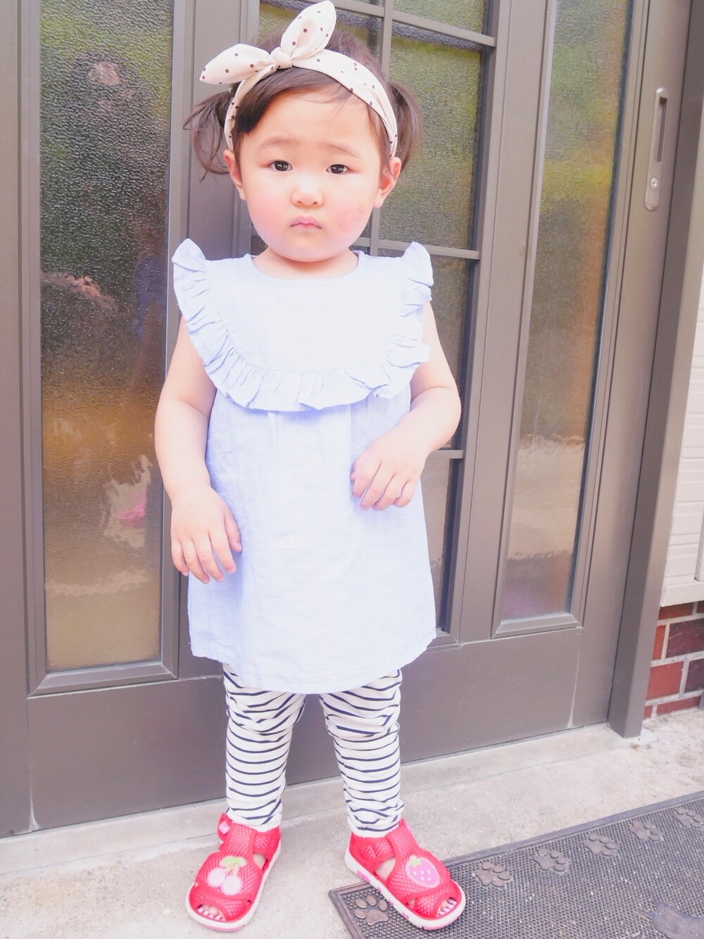 ブルー系のトップス、ブラック系のパンツ、ベージュ系のヘアバンドを着用したキッズの春コーディネートの1枚目の写真