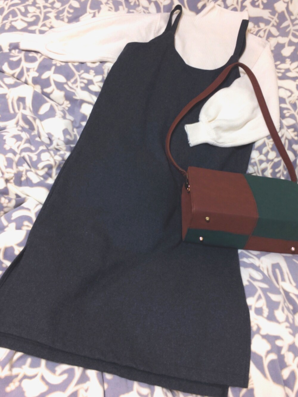 ワンピース:韓国のindibrandで購入したチャコールグレーのワンピース👗 バッグ:古着屋さんで買ったグリーン×レッドのショルダーバッグ。 写真よりストンとした形で、 大人っぽく着られるワンピース。 ワンピースの生地も厚めなのであったかく、冬のデートにもピッタリ🙆♀️ なんじゃないかと思います!