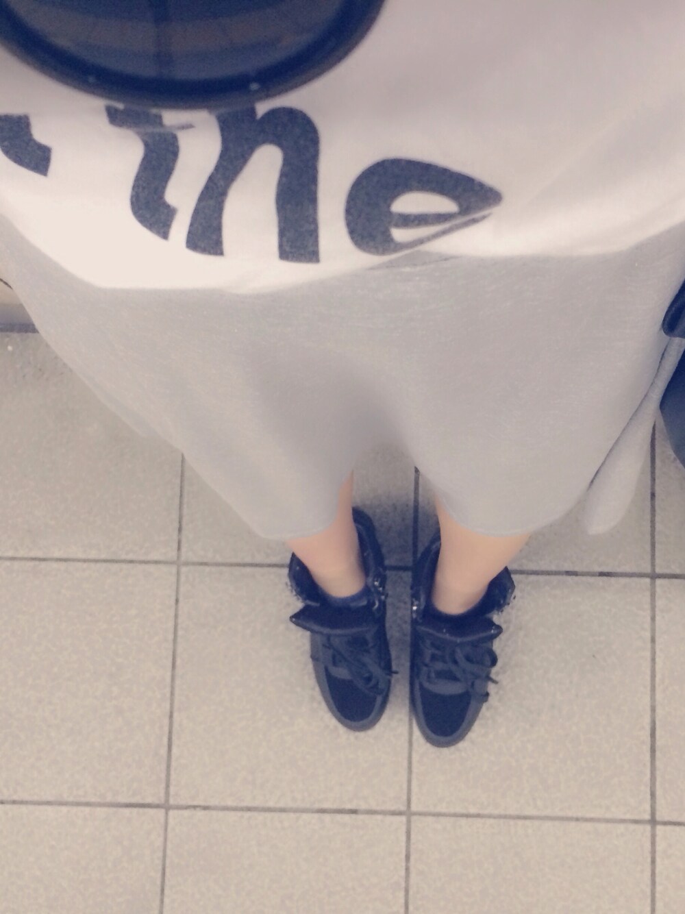 ホワイト系のTシャツ/カットソー、グレー系のスカート、ブラック系のシューズを着用したレディースの夏コーディネートの1枚目の写真
