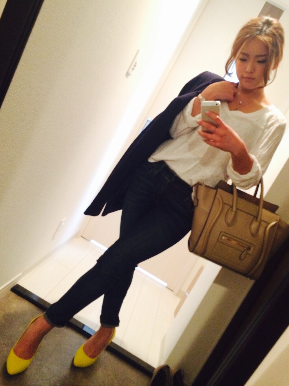 出勤コーデ。 H&M 花柄刺繍トップス、 Denim&Suppryのデニム、 ネイビーJKにイエローパンプス。