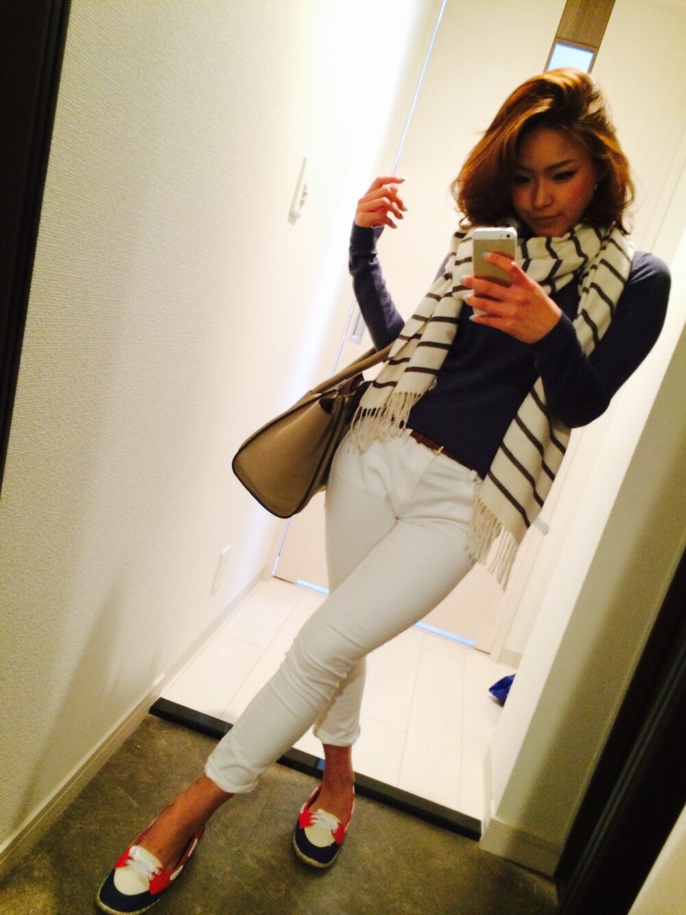 寒かった日の出勤コーデ。 薄ニットに白デニム、 ボーダーマフラーに トリコロールのデッキシューズ。