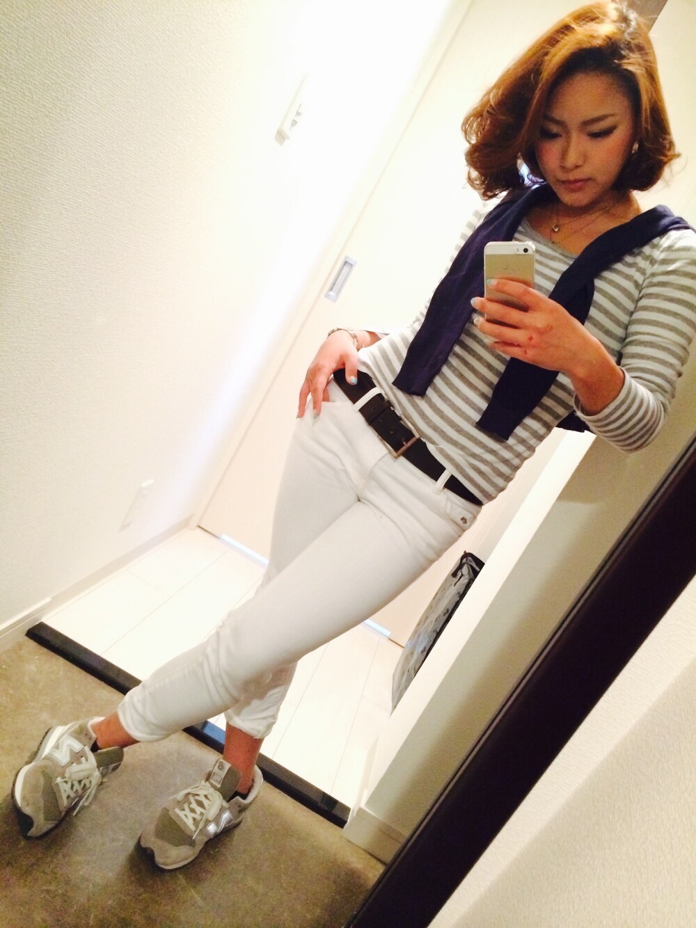 出勤コーデ。 グレーのボーダーロンTに ネイビーカーデを肩掛け。 白デニムにニューバランス996。