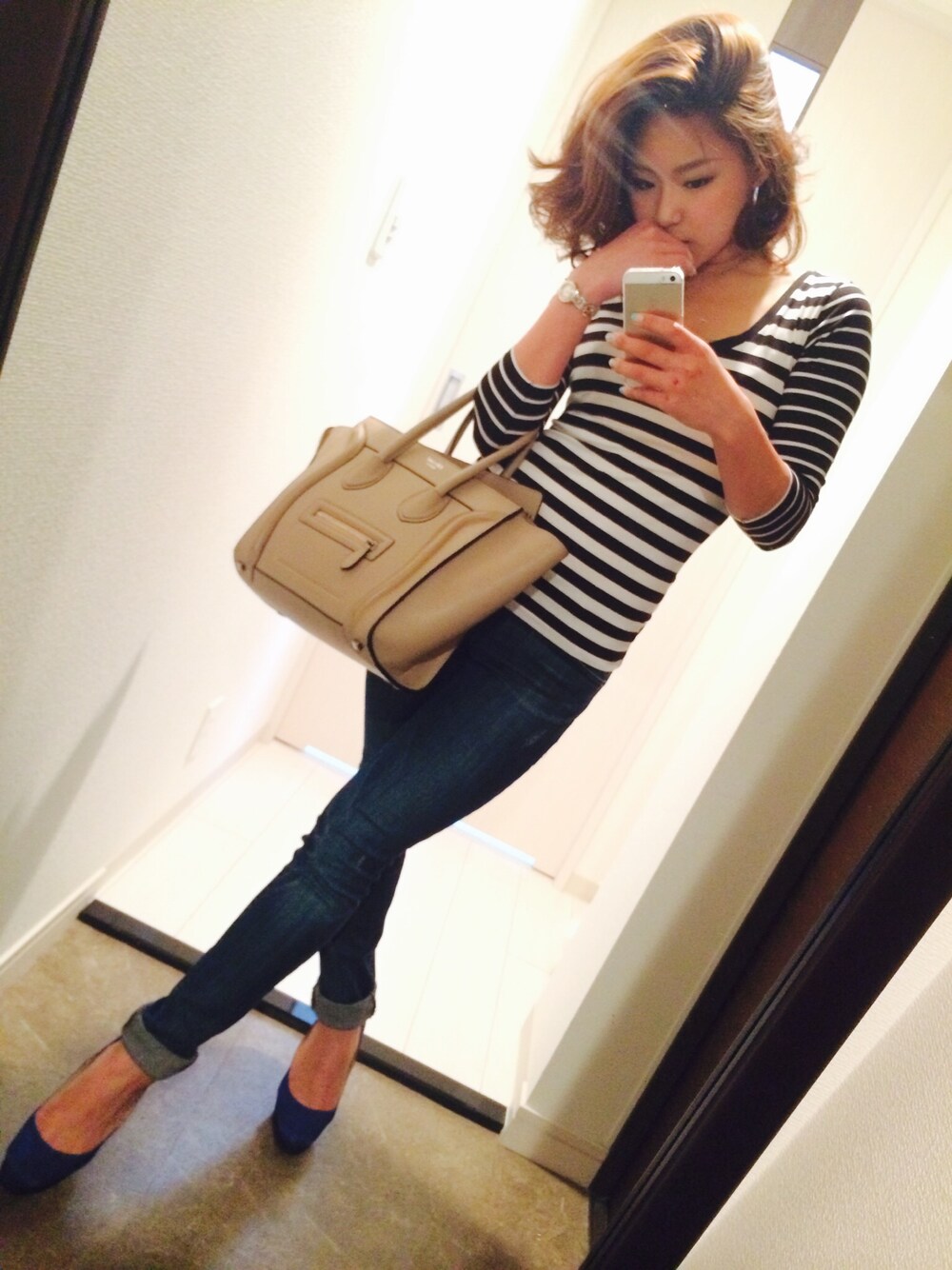 出勤コーデ。 PJボーダートップスに A/Xのスキニーデニム。 エスペランサのネイビーパンプス。 シンプルが大好物ですʕ•̫͡•ོʔ